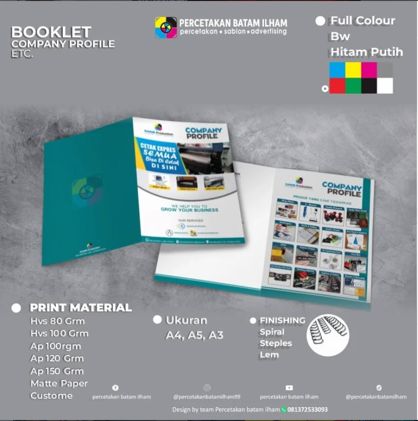 Pilihan Bahan Cover BOOKLET beragam, Gratis Design, dengan minimum order Wujudkan impian Cetak Booklet Company Profiil Anda. Dengan hasil memuaskan.